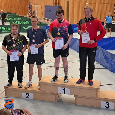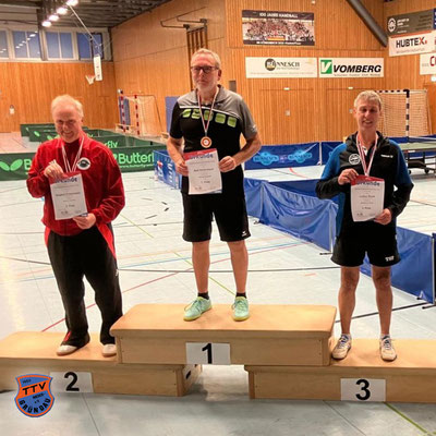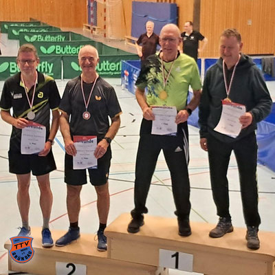 Mit 1508 TTR-Punkten trat er die Reise nach Künzell an, am Ende stand er sensationell ganz oben auf dem Siegertreppchen. 3:1 gewann der 59-Jährige im Finale gegen Carsten Stiehler (TTG Mücke) - an diesem Tag der fünfte (!) Sieg über einen höher gesetzten Gegner. Das ergab einen Pokal und 53 Pluspunkte: Wir ziehen den Hut! Als reiche das nicht, kam noch ein 3. Platz im Doppel gemeinsam mit Benedikt Brundtke (TV Bad Orb) dazu.