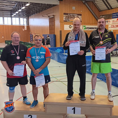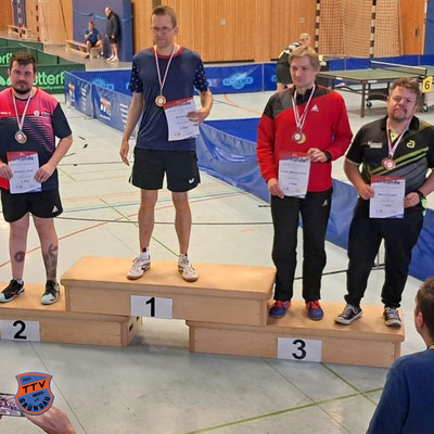 Zum sechsten Mal in den vergangenen sieben Jahren stellen wir einen Teil des Siegerdoppels beim Gründau-Pokal. Diesmal trug sich Rainer Steckel mit dem Hain-Gründauer Luca Waitz in die Siegerliste ein. Auch im zweitplatzierten Doppel stand mit Christian Möller (neben dem Hain-Gründauer Marc-Oliver Michel) ein TTV-Akteur. Dritte wurde unter anderem Lena Sattler zusammen mit Linus Brill (ebenfalls Hain-Gründau).